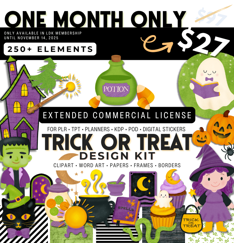A monthly design kit of 250+ coordinated graphics so you'll easily be able to create products that look cohesive, polished, and professional.